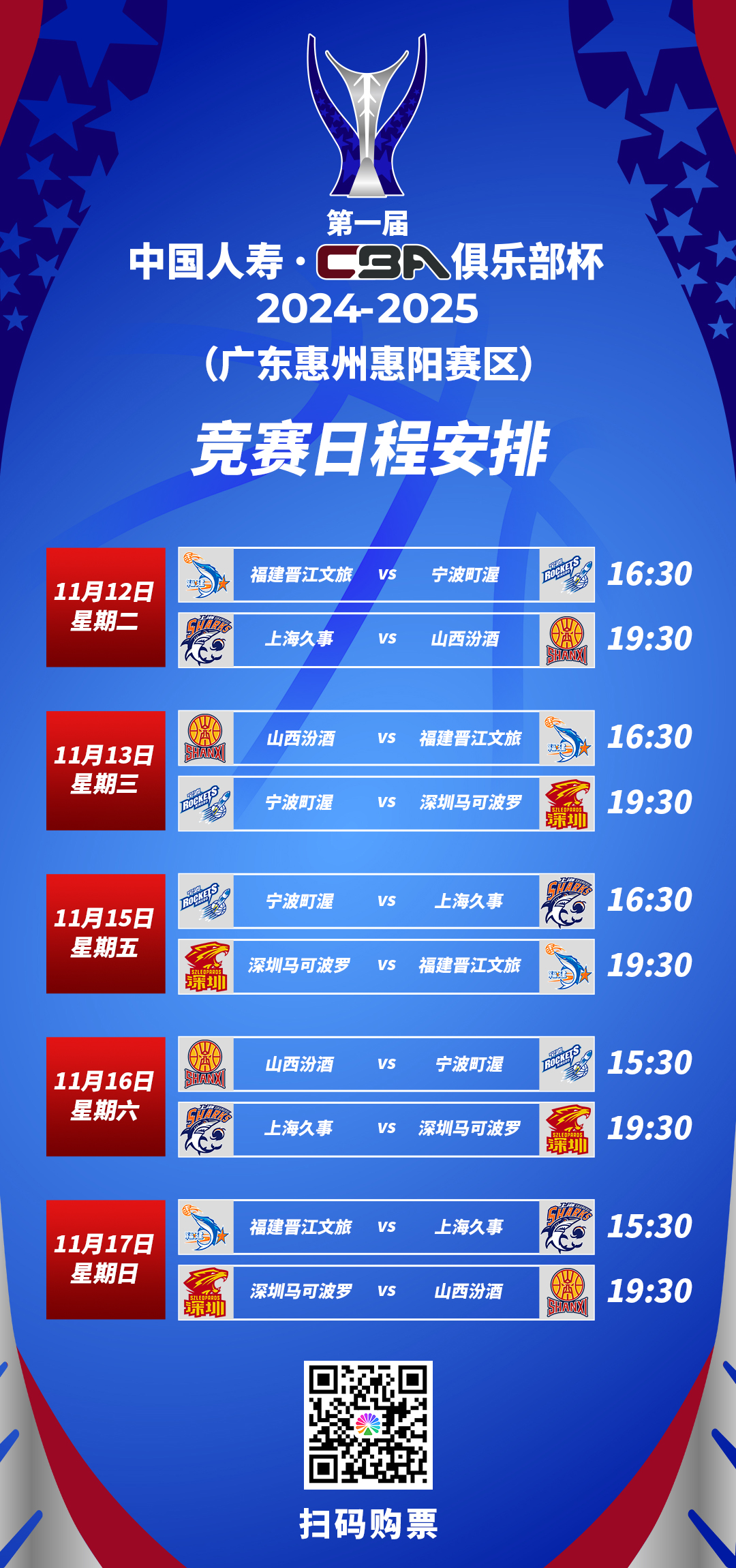 CBA俱乐部杯赛是为积极反应国度“振兴三大球”计谋以及上司主宰部门相干激动赛事纠正、更好地稽查和培养原土球员的系列条目,经上司主宰部门教悔、得意,CBA公司自2024-2025赛季运转,在国外篮联窗口期、CBA联赛暂停期内创办的全新赛事。广东惠州惠阳赛区将举办第一阶段小组赛。